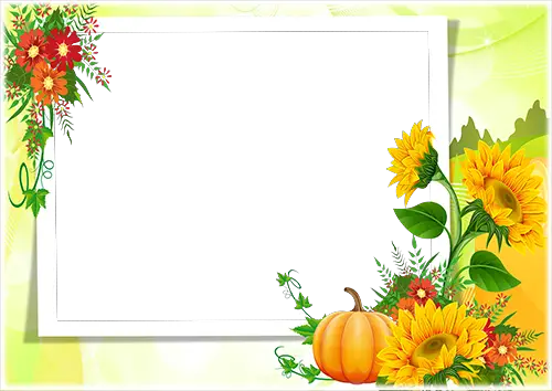 Unique scenery of autumnal season in golden photo frame "Sunflowers and pumpkin" for your taken photos.