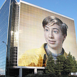 Яскравий фотоефект з вашим величезним фото на фасаді гарного будинку на тлі блакитного неба. Пора будівлю перейменовувати на вашу честь.